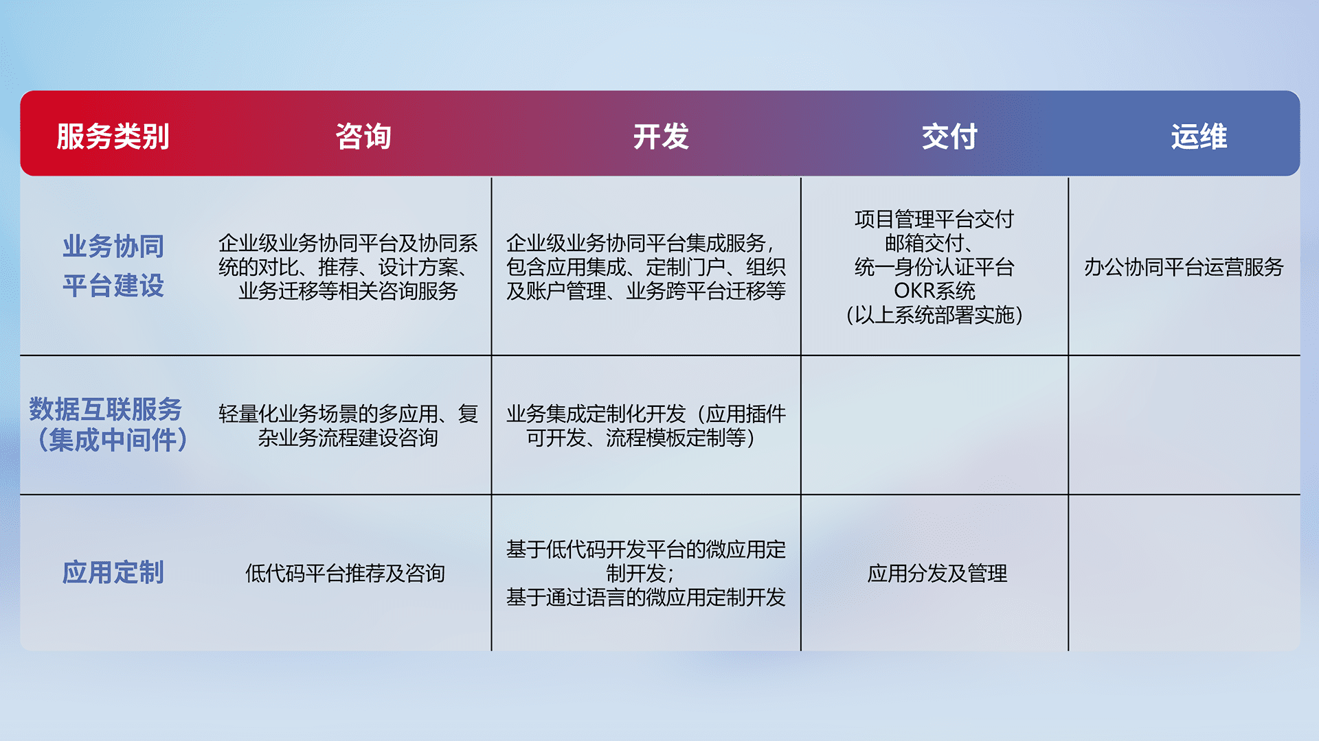 针对钉钉、、企微、、IDaas等平台级产品提供产品的规划、、、、方案、、交付、、、定制化开发等服务,,,实现如统一协同办公、、、智能客户服务、、混合会议管理、、、、智能数据查询、、等业务场景,,实现数字化转型。。。