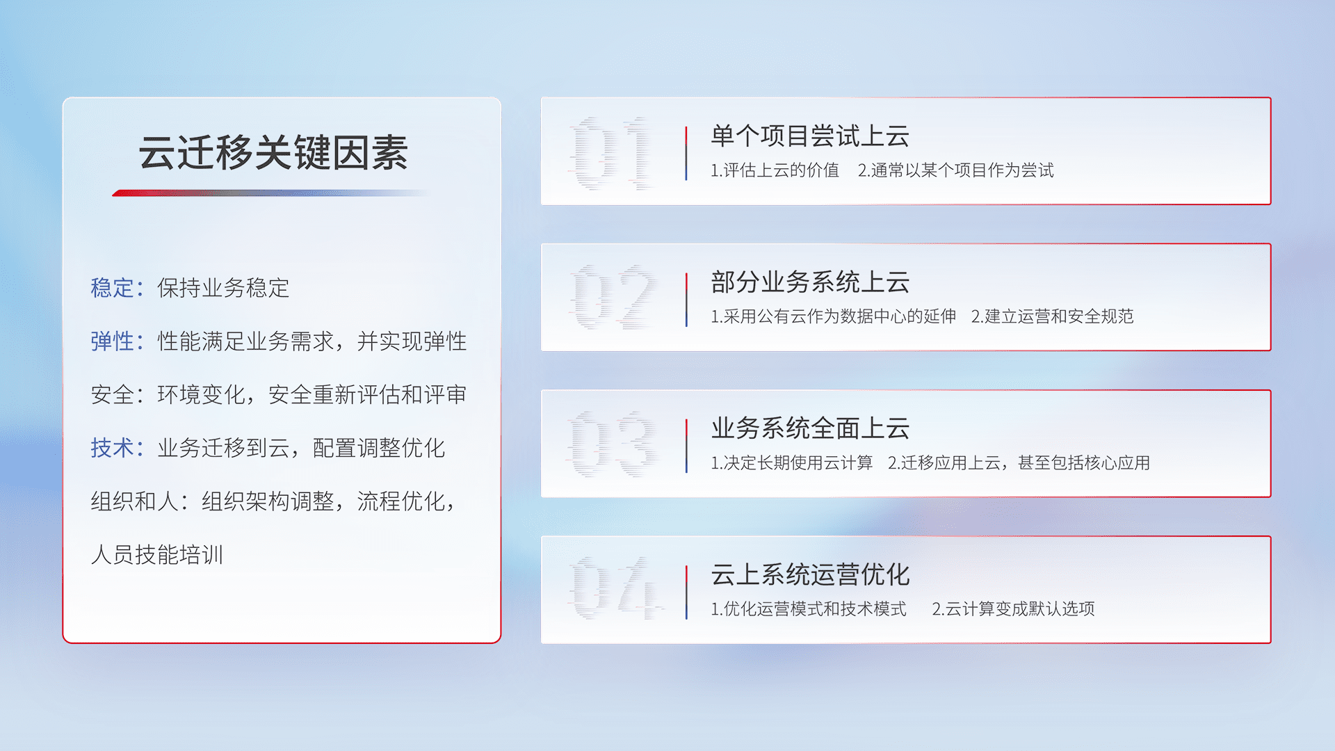 结合实际业务,,,,从规划设计、、云平台选型、、、、云原生改造、、、、数据迁移、、、、集成交付,,迁移全过程为客户识别最佳上云路径,,,做好风险识别管理,,设计网络架构、、、身份权限、、安全审计合规、、、、操作审计、、、、日志审计、、、监控告警策略、、、、多站点容灾设计等,,,对云上基础设施进行整体规划,,,提升IT治理水平,,以满足弹性、、、高可用、、高性能的需求。。。