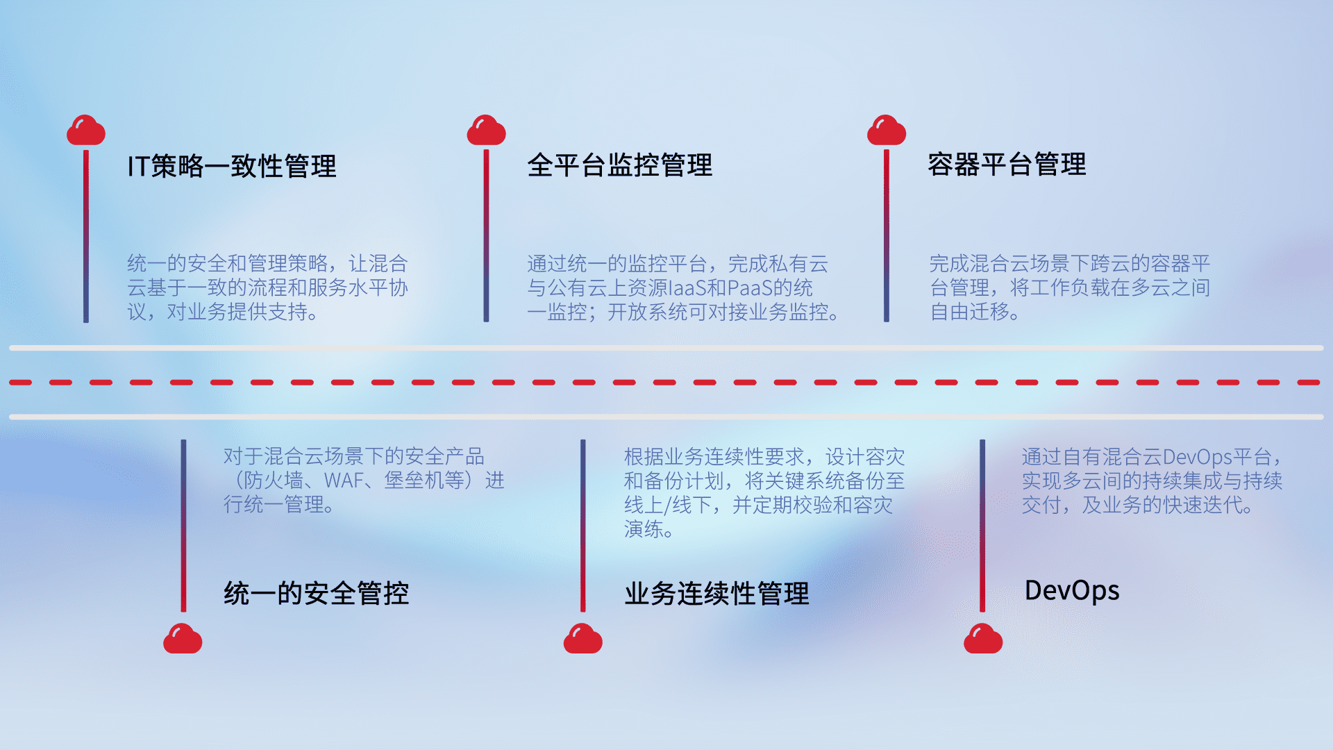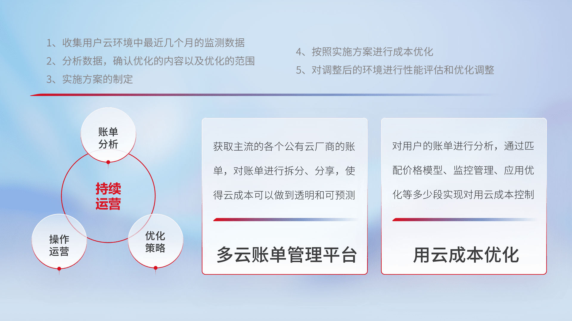 通过多云纳管,,以统一的资源数据模型把客户的云资源进行抽象和封装,,进而实现对多云资源的统一操作,,,,保障云资源管理的可靠性、、、、稳定性与可用性。。量身定制化运维内容,,,配置、、、开发运维、、、、补丁管理、、备份、、、、监控、、、认证和访问管理、、审计和日常巡检等,,,,保障在用云过程中的可靠度,,稳定度以及高可用率。。。