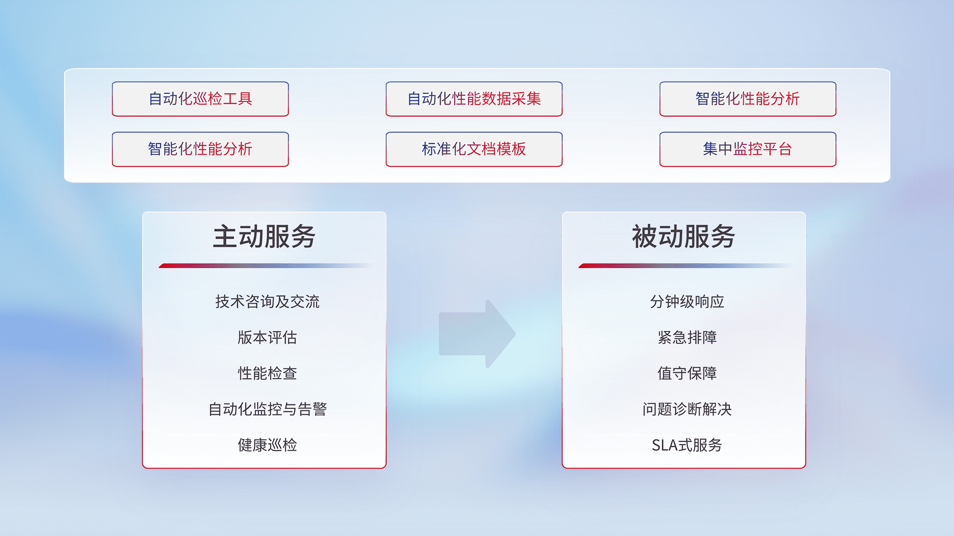 智能化工具和标准化文档,,,保障服务质量,,提供主动服务(包含技术咨询、、版本评估、、、、性能检查、、、自动化监控与告警、、、健康巡检)和被动服务包含(分钟级响应、、、、紧急排障、、、值守保障、、、问题诊断解决、、、、SLA服务)。。